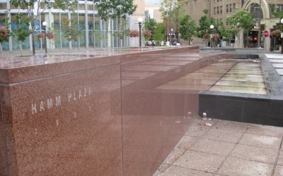 Artist Jackie Ferrara redesigned the space in 1992 when the plaza was rededicated to the Hamm family in 1992 with support from The St. Paul Companies (now Travelers). Her work includes a trough/fountain that flows into a semi-circle basin, geometric paving tiles and the walls, steps and trees.
