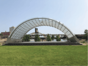 The Schubert Club Heilmaier Memorial Bandstand is a beloved flourish on Saint Paul’s Raspberry Island (formerly Navy Island). Its glass and steel design echoes the curves of nearby bridges, the lap of waves along the mighty Mississippi and the hulls of boats that ply the river. When lit at night, it becomes a beckoning lantern on the dark water.