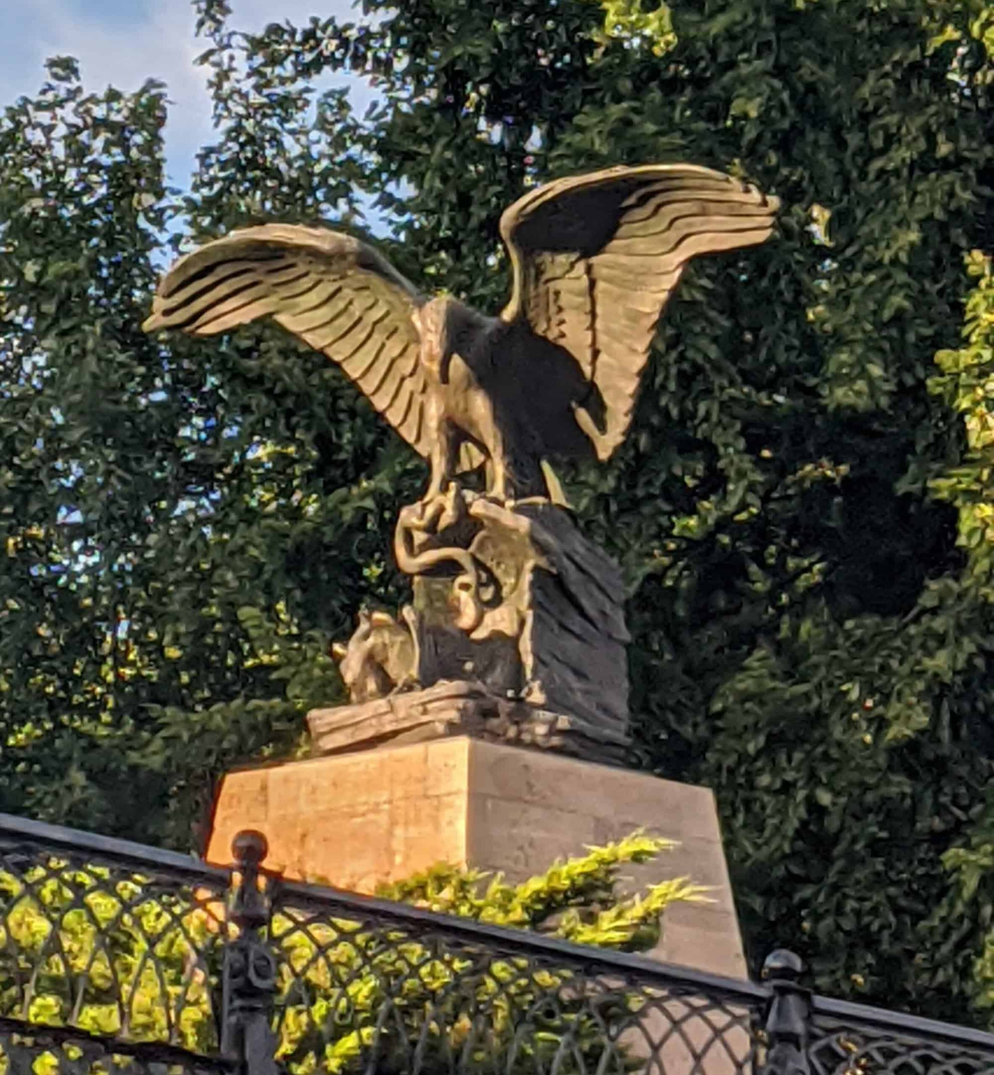 Fast forward and the beautifully restored New York Life Eagle alit in Summit Overlook/Lookout Park on June 29, 2004 thanks to hard work by Public Art Saint Paul, Ramsey Hill Association, Saint Paul Parks and Recreation, and the Saint Paul Design Center. The Lookout Park Partnership renovated the park, with major support from Ruth and A.J. Huss, Dusty and George Mairs, Rotary Club of Saint Paul, City of Saint Paul STAR program, and many generous individuals. The Park was rededicated on August 13, 2008.